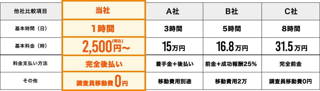 当社では、大手探偵社の料金を調べ、 必要以上に経費をかけずに調査料金を抑えるように努力しています。